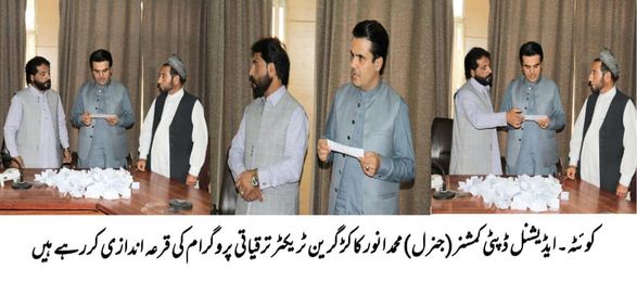 Green Tractor Development Scheme, Draw Announced. Mr. Anwar Khan Kakar Additional Deputy Commissioner (General) Quetta, announced the draw for Green Tractor Scheme. You Might Also Like Plantation in City March 6, 2023 Rate list 30/12/2023 January 1, 2024 Deputy Commissioner Quetta Lieutenant (R) Saad bin Asad SSP Operation Jawad Tariq and District Election Commissioner Nazir Harifal are visiting the ongoing election training center at Government Sandeman High School. January 24, 2024