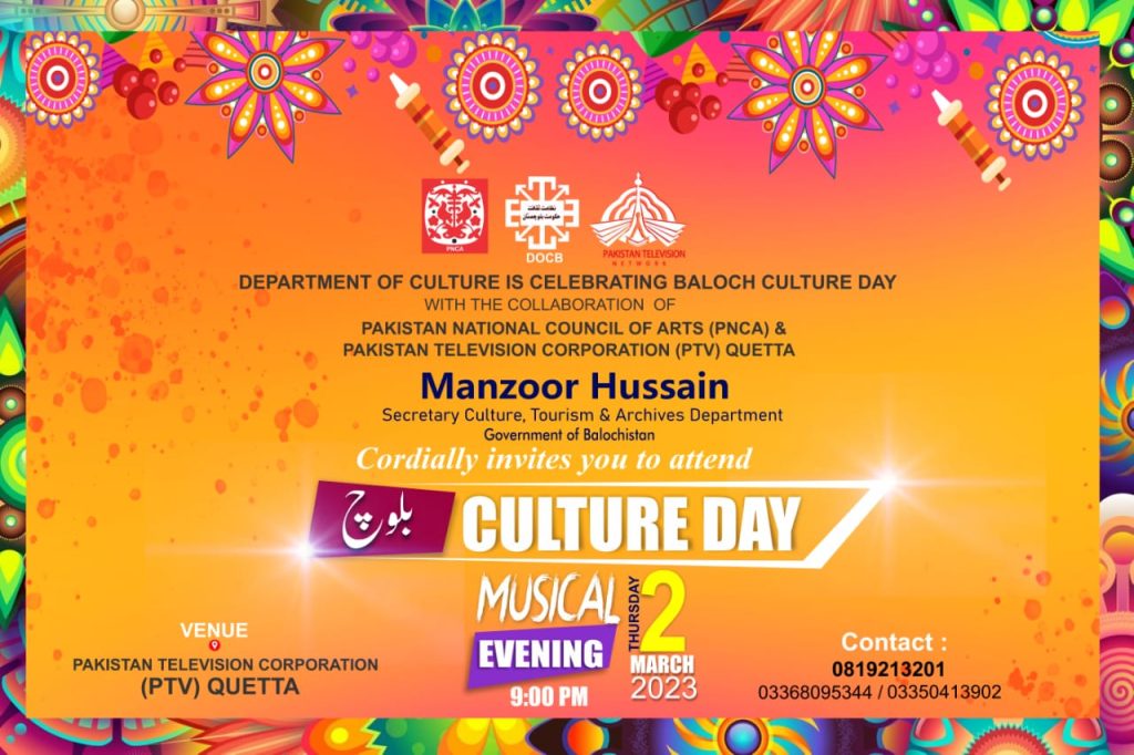 Happy Baloch Culture Day Deputy Commissioner Quetta, Mr. Shaihak Baloch Cordially Greet the people of Quetta BALOCH CULTURE DAY- 02 March 2023 You Might Also Like 76 JASHAN e AZADI in QUETTA August 15, 2023
